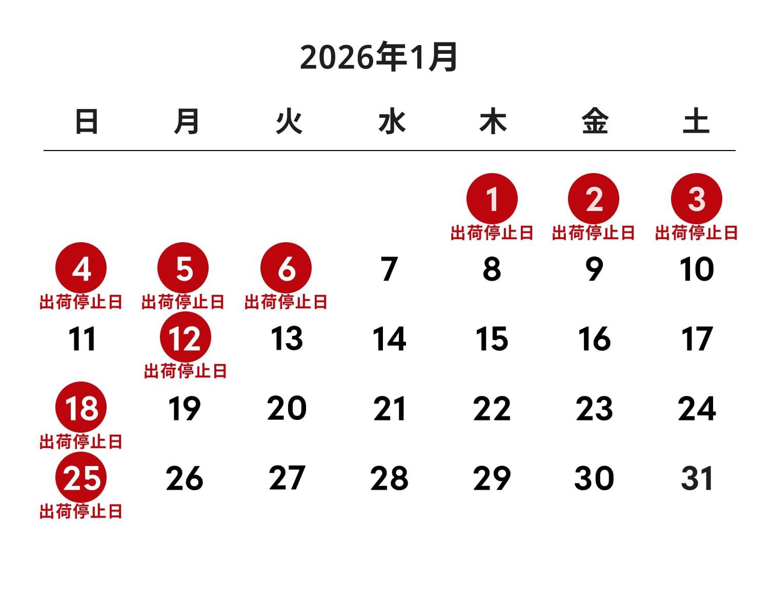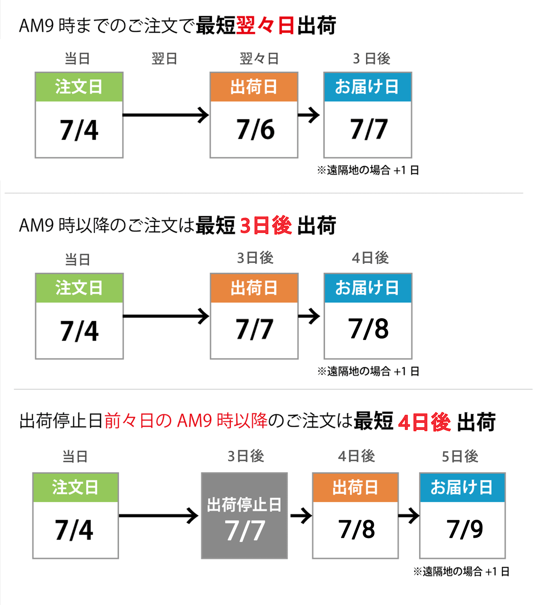 日曜または3連休の最終日は出荷停止日となります。